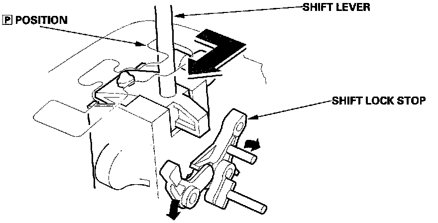 In the [P] position while pressing the brake pedal, the shift lock solenoid is turned ON, and the shift lock solenoid plunger is retracted to release the shift lock stop. This allows the shift lever to be moved.