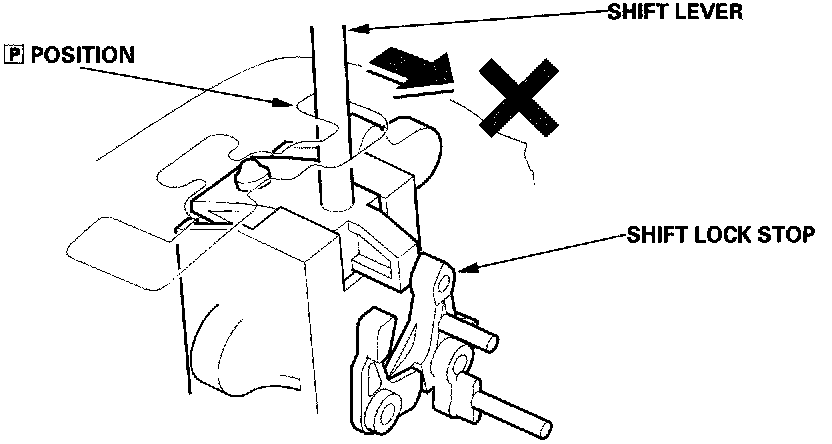 The shift lever shifts between positions along the gate in the A/T gear position indicator panel. The shift lever can shift out of the [P] position and into the [D] position without pressing the shift lever. The shift lock/reverse lock mechanism is an additional shift lever lockout mechanism.
