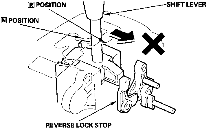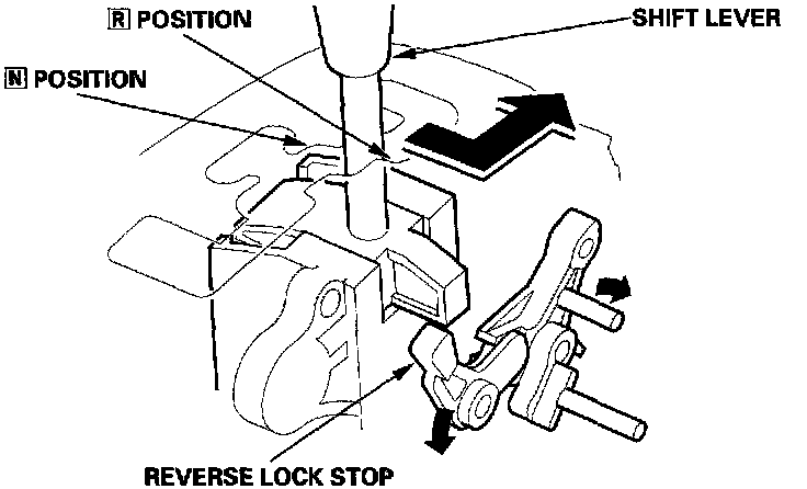When the shift lever is shifted to the [R] position from the [D5] position and the [N] position (under certain conditions), the shift lock solenoid is turned ON, and the shift lock solenoid plunger is retracted to release the reverse lock stop. This allows the shift lever to be moved to the [R] position.