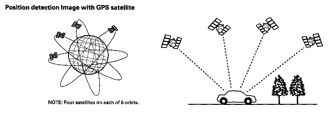 The Global Positioning System (GPS) enables the navigation system to determine the current position of the vehicle by using the electronic waves transmitted from the satellites in orbit around the earth. The satellites transmit the satellite identification signal, orbit information, transmission time signal, and other information. When the GPS receiver receives the electronic waves from three or more satellites simultaneously, it calculates the current position of the vehicle based on the distance to each satellite and the satellite positions on their respective orbits.