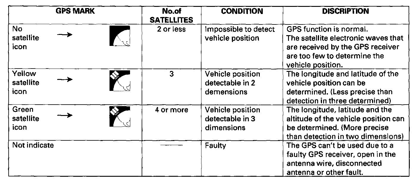 The precision of the GPS varies according to the number of satellites from which electric waves are received and the control condition. The precision is indicated by the GPS mark shown on the upper left of the display.