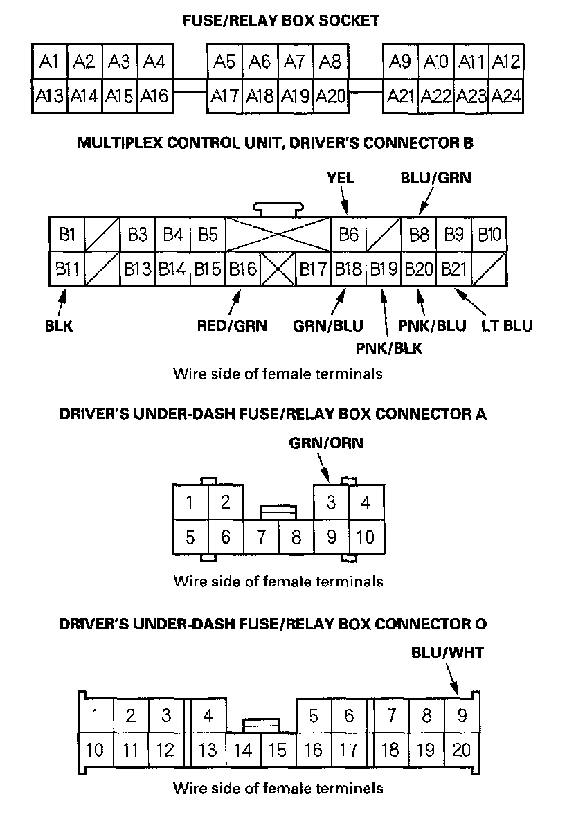 4. With the driver's multiplex control unit still disconnected, make these input tests at the connector and driver's under-dash fuse/relay box sockets.