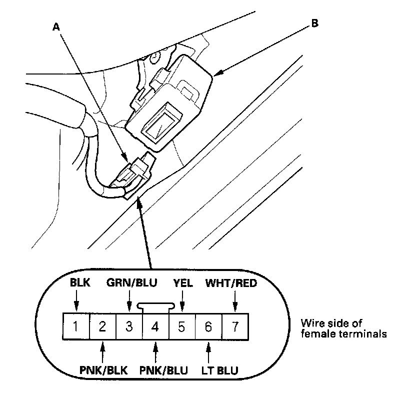 2. Disconnect the 7P connector (A) from the keyless receiver unit (B).