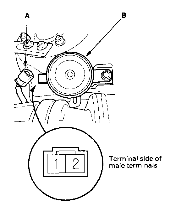 3. Test the horn by connecting battery power to No. 2 and grounding to No. 1 terminals. The horn should sound.
