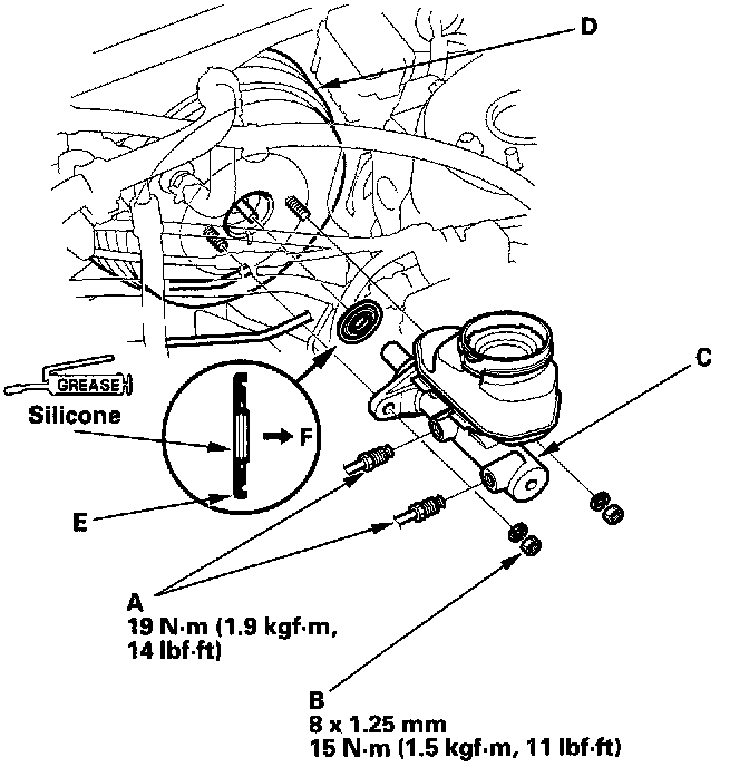 ^ Install the rod seal onto the master cylinder with its grooved side (F) toward the master cylinder.