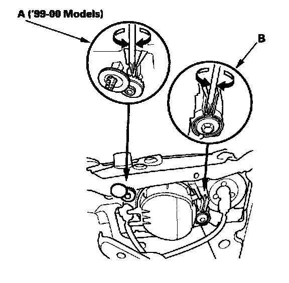 7. If necessary, adjust the headlights to local requirements by turning the horizontal adjuster '99-00 models (A) and the vertical adjuster (B).