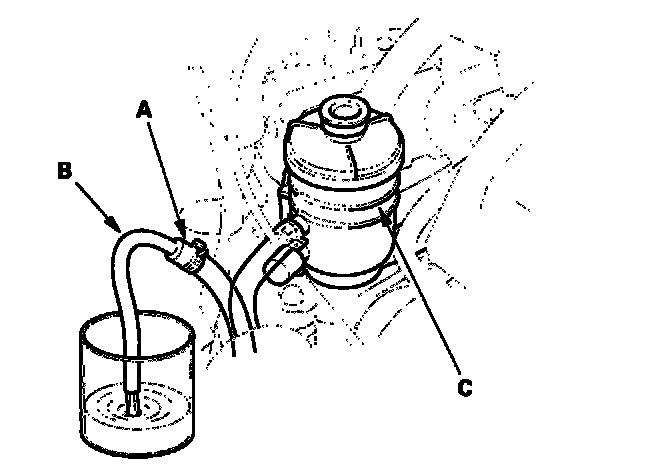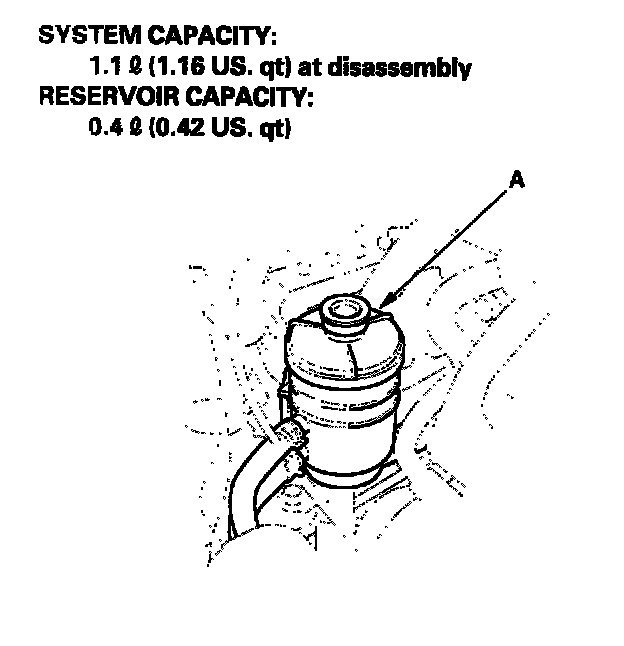 1. Remove the power steering reservoir from its holder. Raise the reservoir, then disconnect the return hose (A) to drain the reservoir. Take care not to spill the fluid on the body and parts. Wipe off any spilled fluid at once.