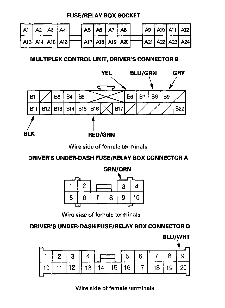 5. Reconnect the driver's multiplex control unit to the driver's under-dash fuse/relay box, and perform the following input tests at the appropriate connectors on the back of the driver's under-dash fuse/relay box.