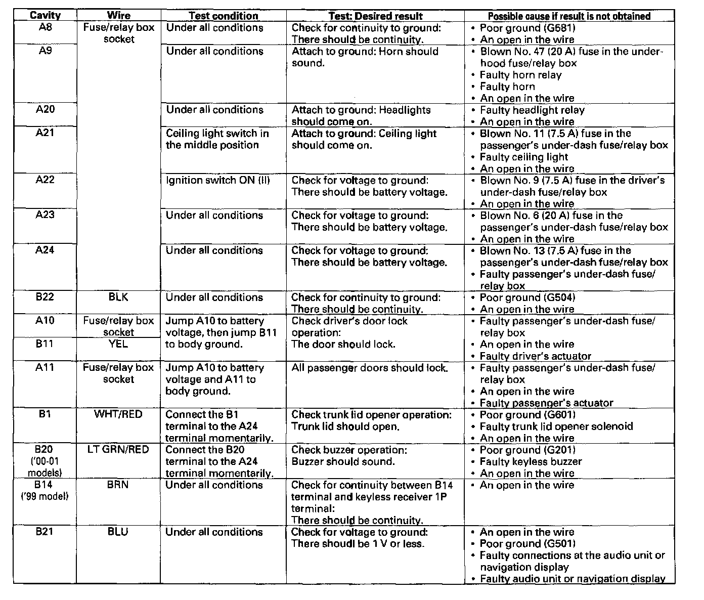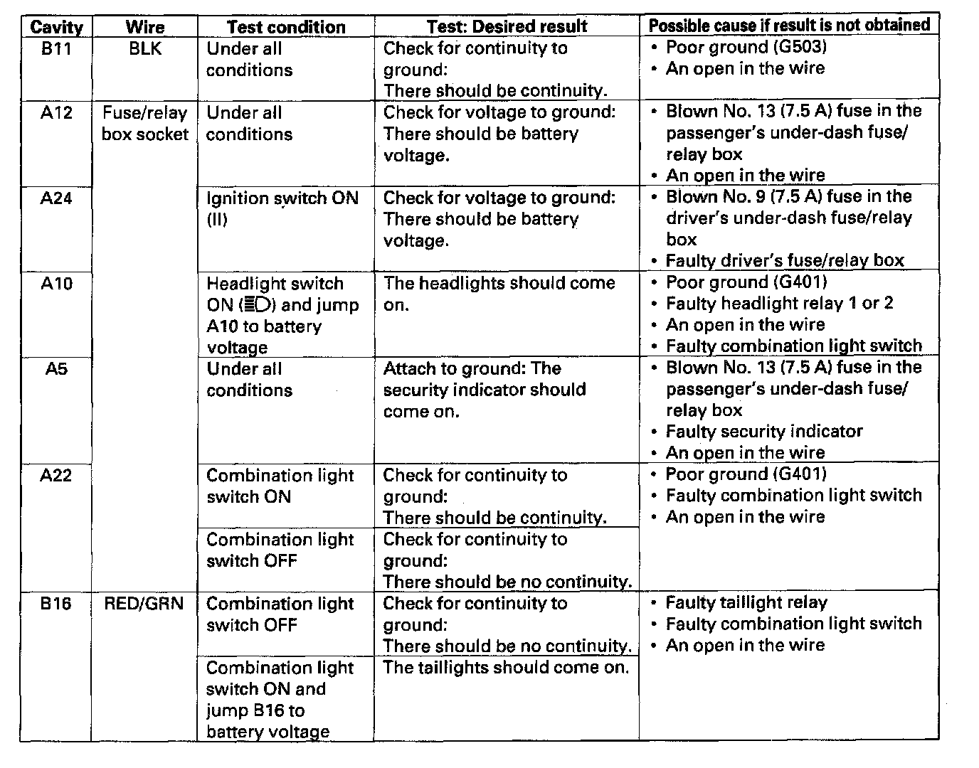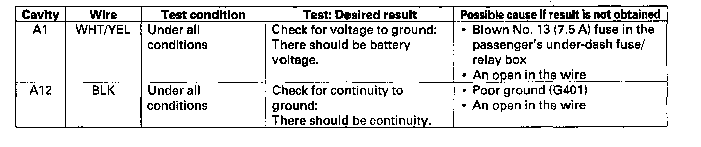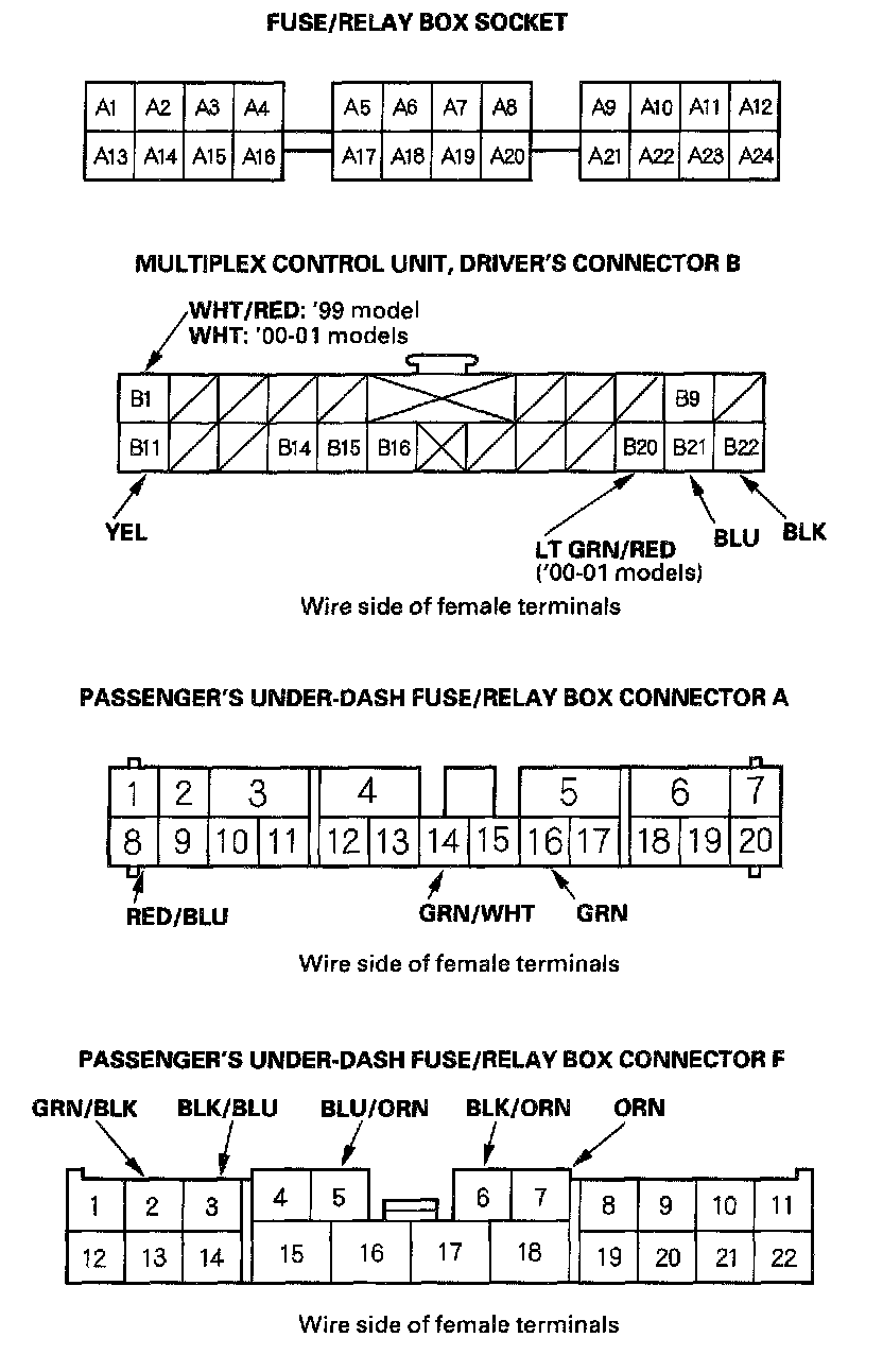 8. With the passenger's multiplex control unit still disconnected, make these input tests at the connectors and the passenger's under-dash fuse/relay box sockets.