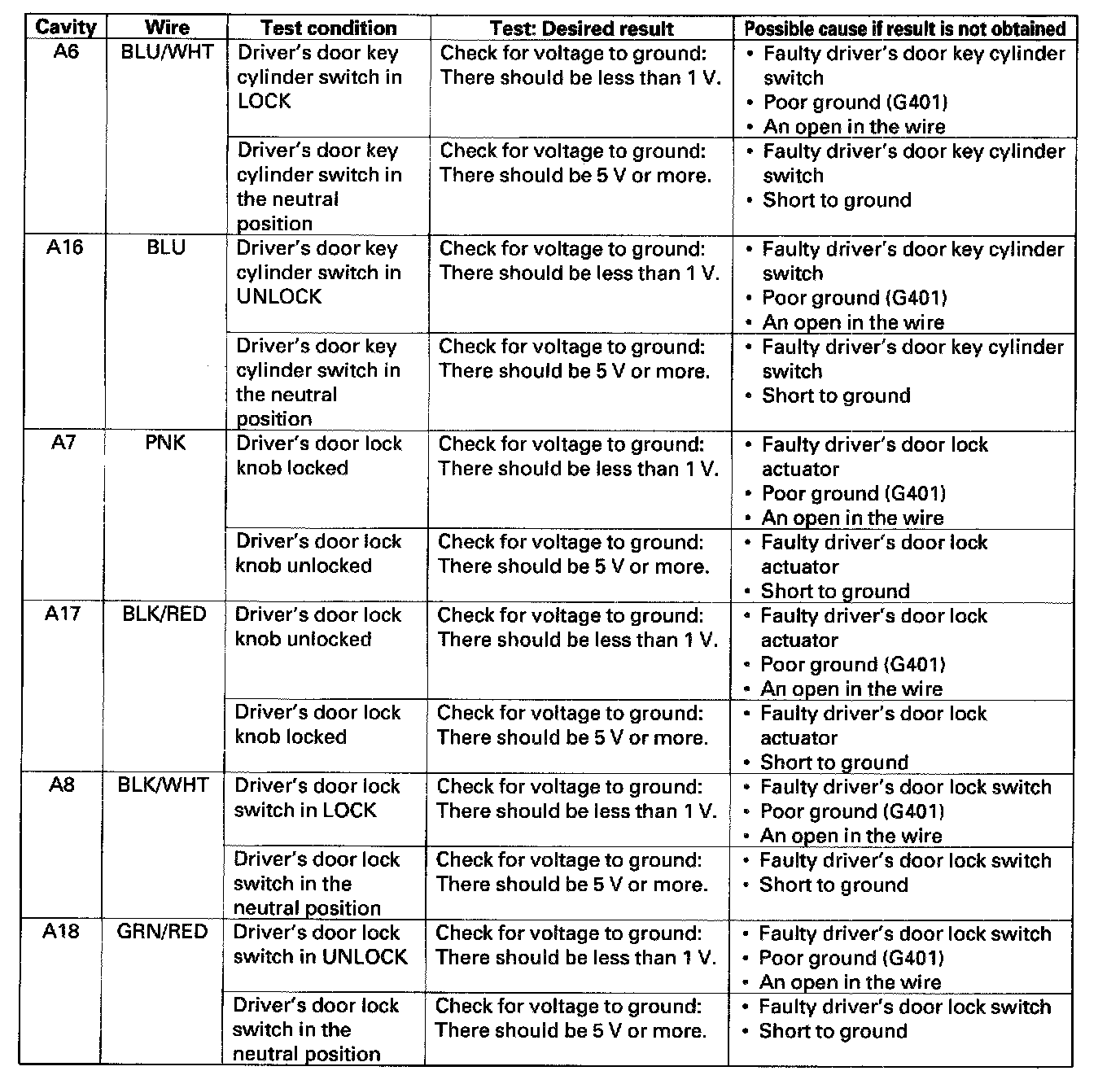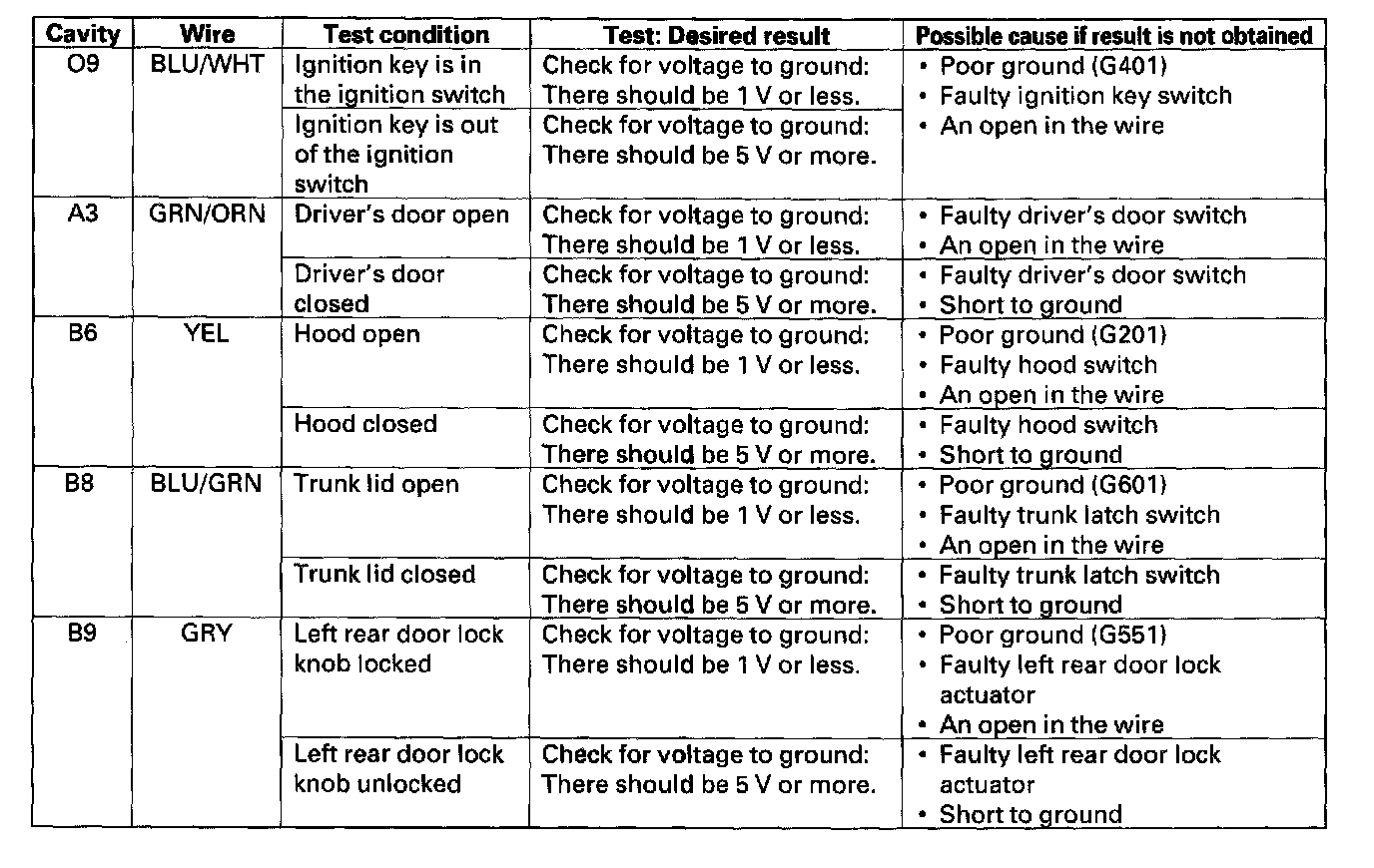 12. With the door multiplex control unit still disconnected, make these input tests at the connector.