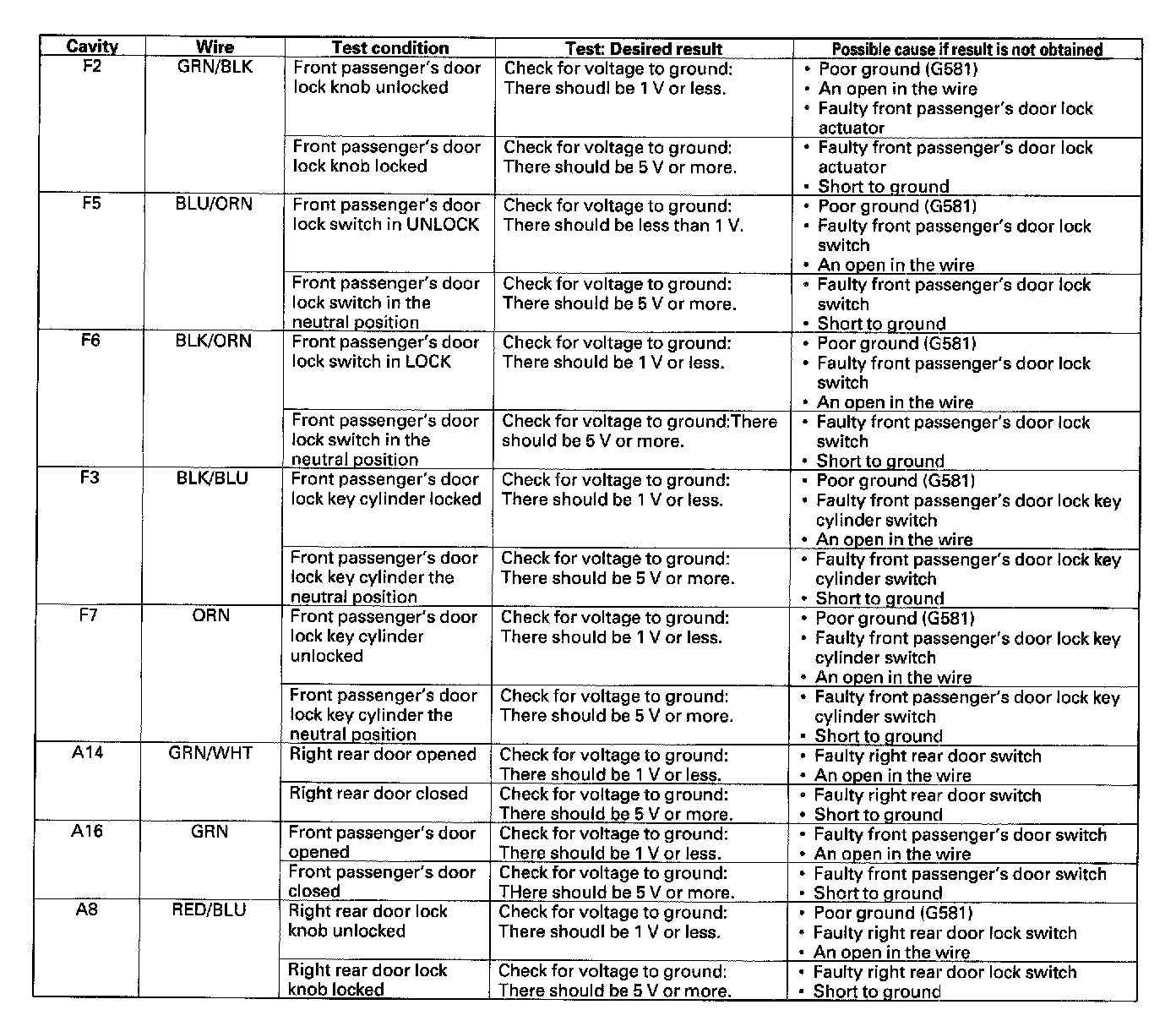 13. Reconnect the connector to the door multiplex control unit, make these input tests at the connector.