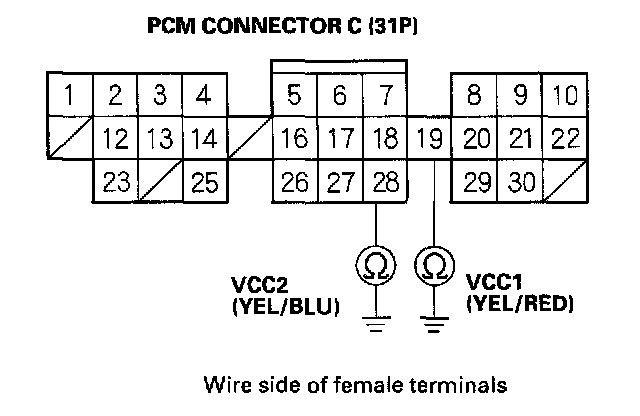 12. Disconnect the 3P connector from each of these sensors, one at a time, and check for continuity between body ground and PCM connector terminal C19 and C28 individually.