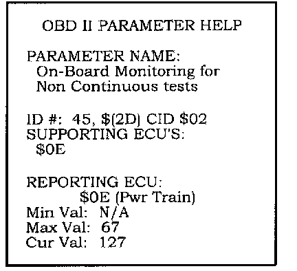 9. Review the information on the Test ID screen. If you see a TID that failed, scroll down to that TID, hold down the * key, then press the HELP key to get the OBD II PARAMETER HELP screen. This screen shows you the TID the minimum and maximum values that the system expects, and the current value (the value from the last time the ECM/PCM did this specific test). Write down or print out these values for each TIE) that failed. To return to the Test ID screen, press the EXIT key.