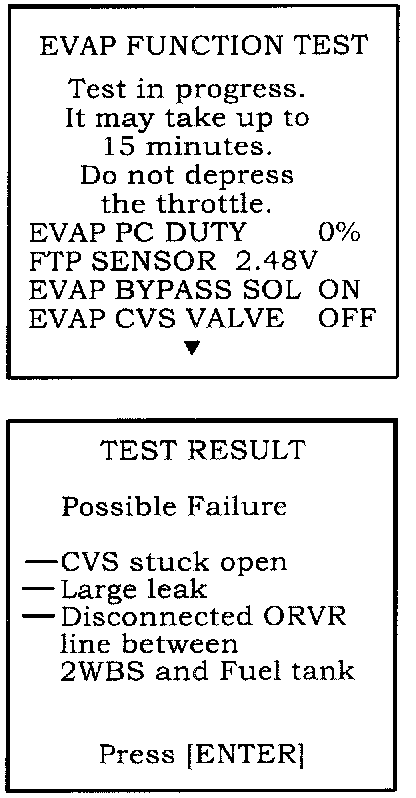 Software version SN211 and later can do a complete function test of the vehicle's EVAP system. The PGM Tester works the EVAP system solenoids and checks for system integrity. If a problem is found, the PGM Tester shows that the function test has failed, and it lists several components that may be at fault. If you believe the failure is intermittent, you may want to run this test several times. If you do. waiting an hour or two between test sessions or moving the vehicle outdoors to cool down overnight between tests could help with diagnosis.