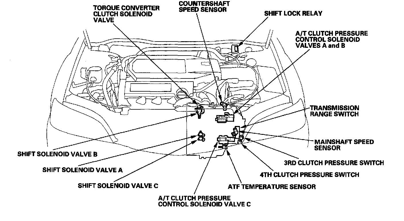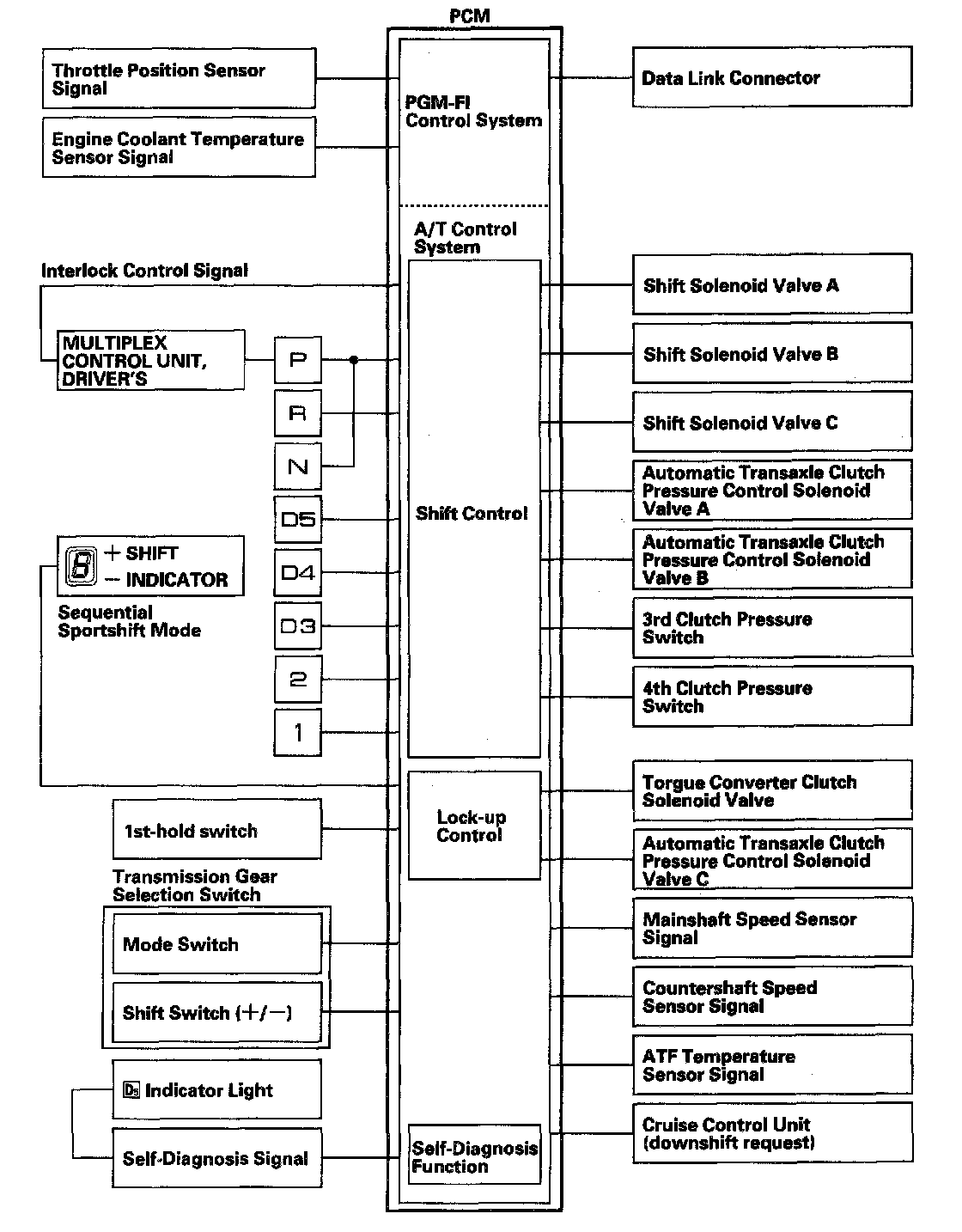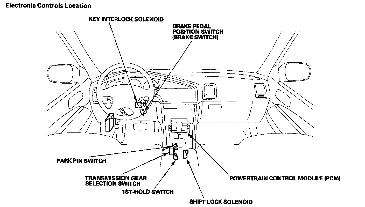 Functional DiagramThe electronic control system consists of the Powertrain Control Model (PCM), sensors, and 7 solenoid valves. Shifting and lock-up are electronically controlled for comfortable driving under all conditions. The PCM is located below the dashboard, under the front lower panel behind the center console.