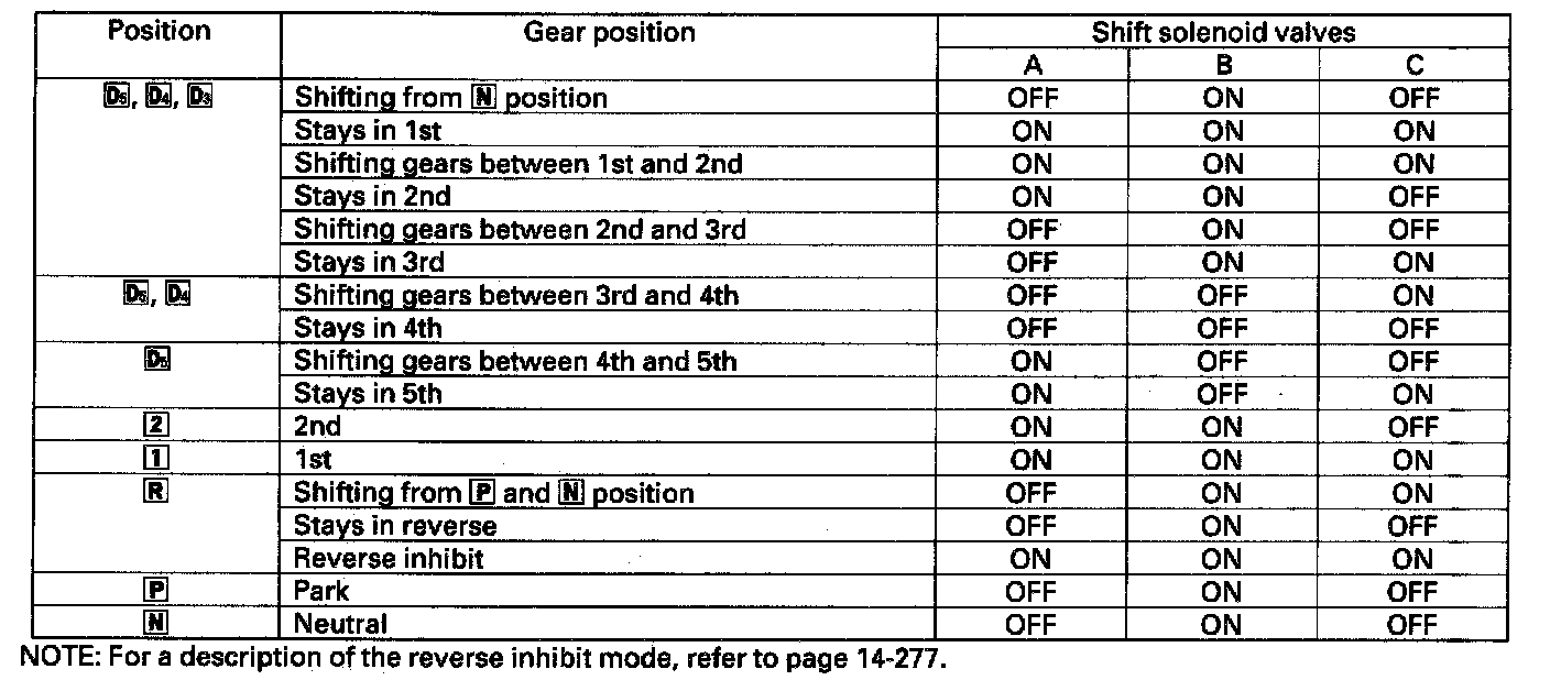 Shifting is related to engine torque through the solenoid valves, which are controlled by the PCM. The PCM instantly determines which gear should be selected by various signals sent from sensors, and actuates the shift solenoid valves A, B, and C to control shifting. Also, a Grade Logic Control System has been adopted to control shifting in D5, D4 and D3 positions while the vehicle is ascending or descending a slope, or reducing speed. The combination of driving signals to shift solenoid valves A, B, and C are shown in the table.