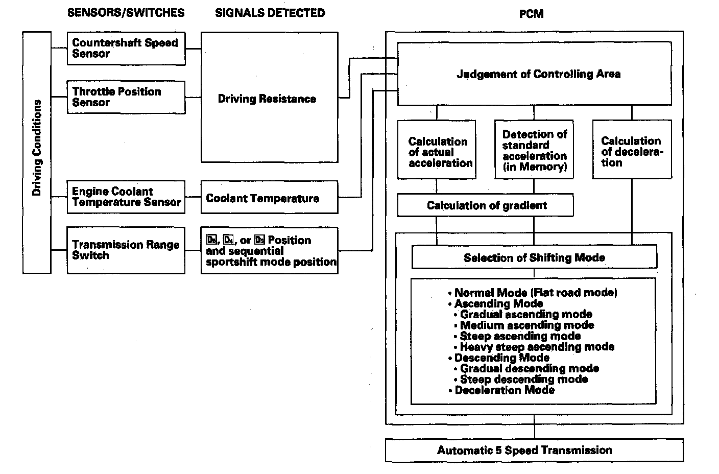 The PCM compares actual driving conditions with memorized driving conditions, based on the input from the countershaft speed sensor, the throttle position sensor, the engine coolant temperature sensor, the brake pedal position switch signal, and the shift level position signal, to control shifting while the vehicle is ascending or descending a slope, or reducing speed.