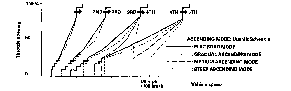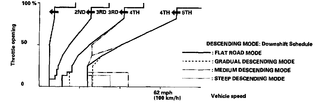 When the PCM determines that the vehicle is going down a hill in D5, D4, and D3 positions and the sequential sportshift mode position, the shift-up speed from 4th to 5th gear, 3rd to 4th gear and from 2nd to 3rd (when the throttle is closed) becomes faster than the set speed for flat road driving to widen the 4th gear, 3rd gear and 2nd gear driving areas. This, in combination with engine braking from the deceleration lock-up, achieves smooth driving when the vehicle is descending. There are 3 descending modes with different 4th gear driving areas, 3rd gear driving areas and 2nd gear driving areas according to the magnitude of a gradient stored in the PCM. When the vehicle is in 5th gear or 4th gear, and you are decelerating when you are applying the brakes on a steep hill, the transmission will downshift to lower gear. When you accelerate, the transmission will then return to higher gear.