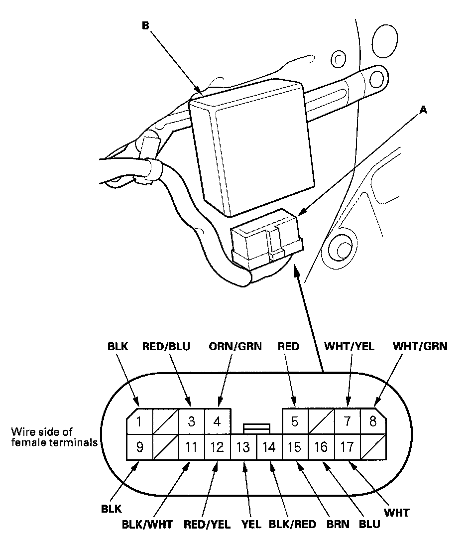 2. Disconnect the 18P connector (A) from the power window control unit (B).
