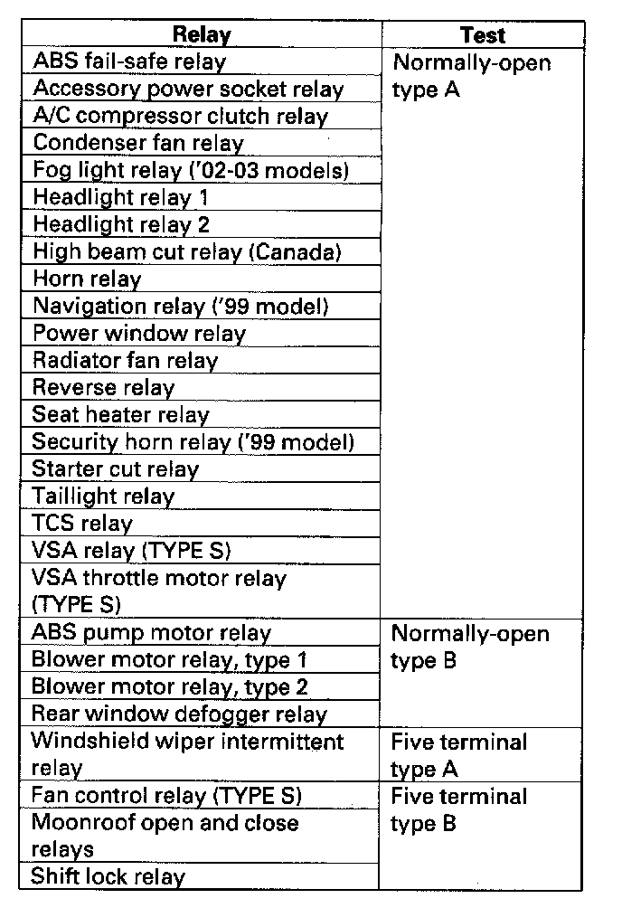 Power Relay TestUse the chart to identify the type of relay, then do the test listed for it.