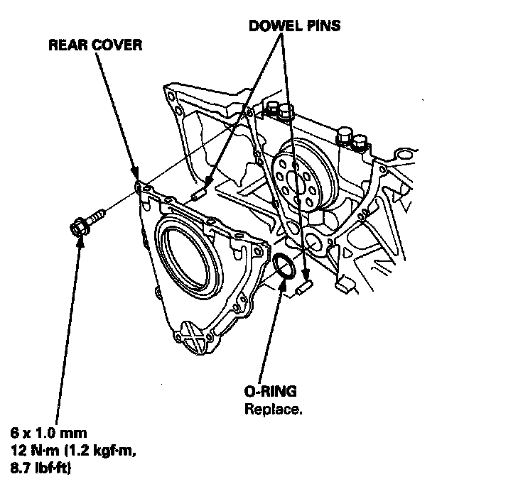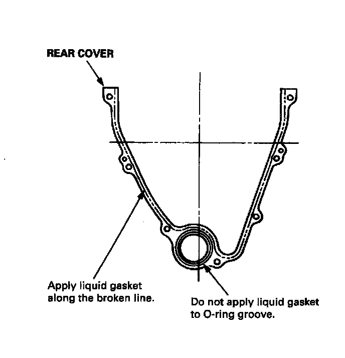 10. Apply liquid gasket to the cylinder block mating surface of the rear cover, then install the cover on the cylinder block.