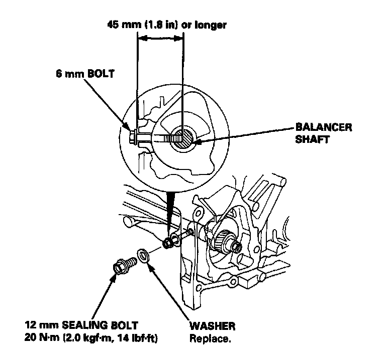 20. Align the maintenance hole and the balancer shaft hole. Insert a 6 mm bolt that is at least 45 mm (1.8 inch) long into the balancer shaft.