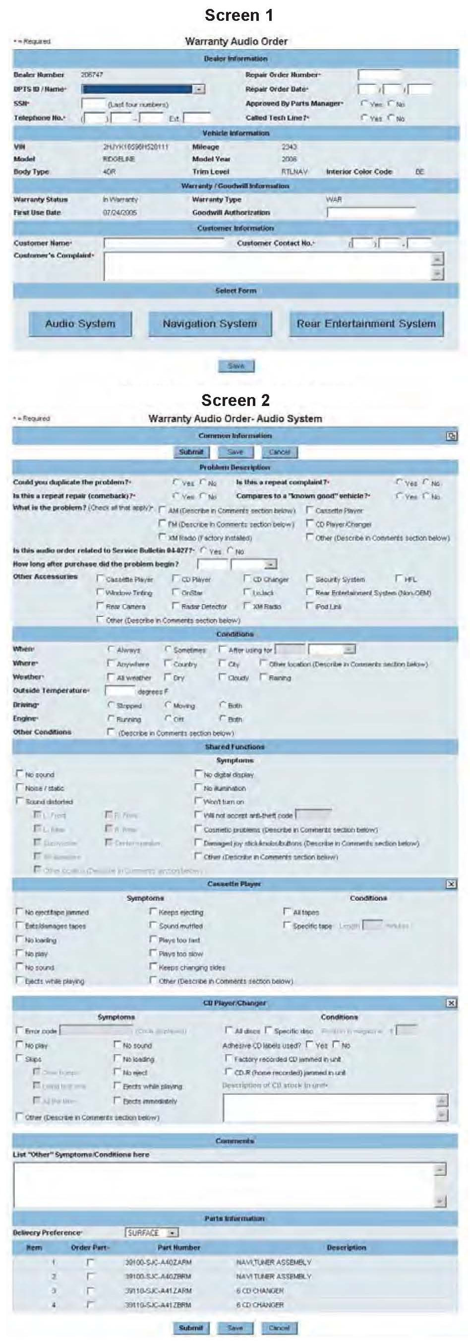 Screen # 2 of the form contains the problem description, condition information, and shared functions. Fill this section out with as much information as possible. Select one part number from the list provided, then click on Submit. It is your responsibility to ensure that the correct part number is selected based on color and application information.