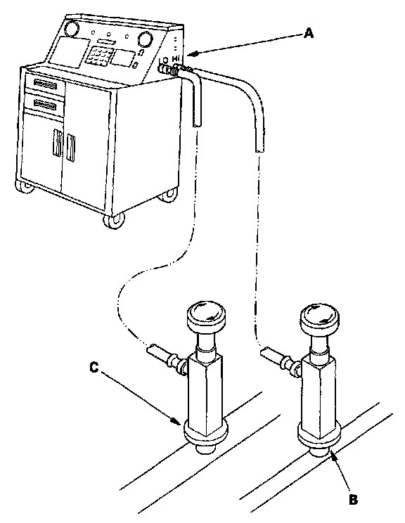 1. Connect a R-134a refrigerant recovery/recycling/charging station (A) to the high-pressure service port (B) and the low-pressure service port (C), as shown, following the equipment manufacturer's instructions.