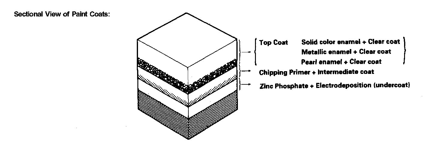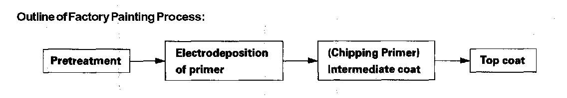 In the pretreatment process, the entire body is degreased, cleaned, and coated with zinc phosphate by dipping. After the body has been cleaned with pure water, it is placed in an electrolytic bath of soluble primer (Cationic Electrodeposition). This produces a thorough corrosion inhibiting coating on the inner surface and corners of the body, pillars, sills, and panel joints. Chipping primer is then applied to the most susceptible areas.