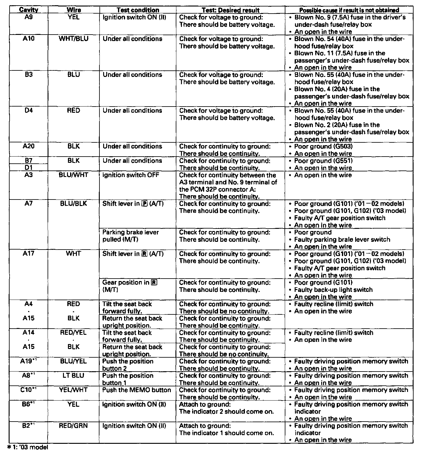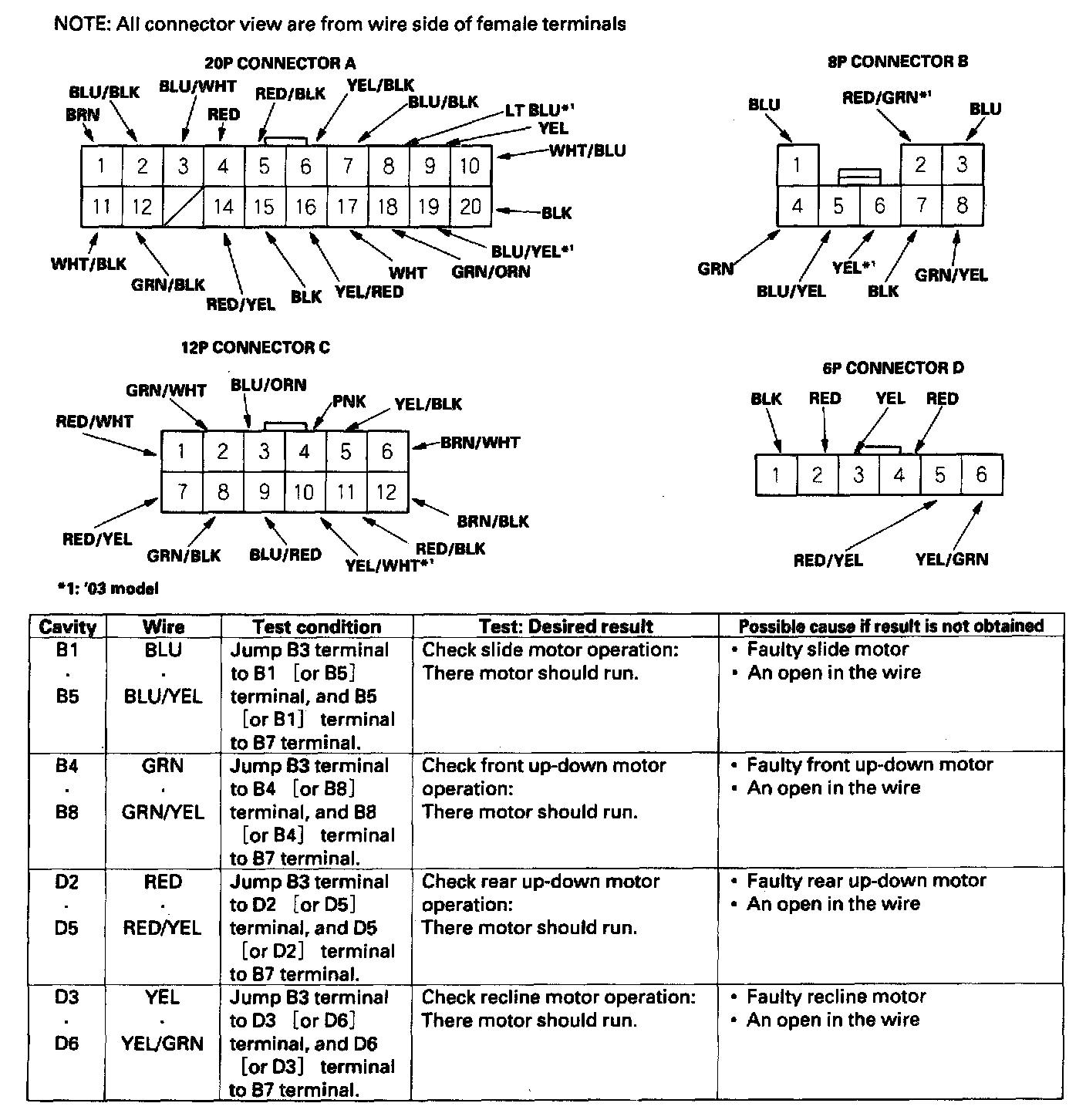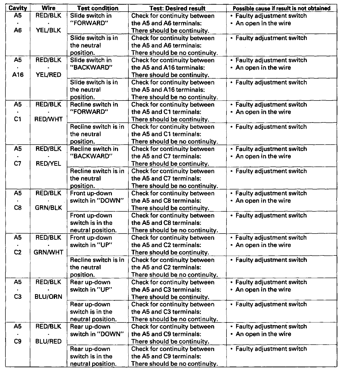 5. Reconnect the connectors to the driver's power seat control unit, and make these input tests at the connectors.