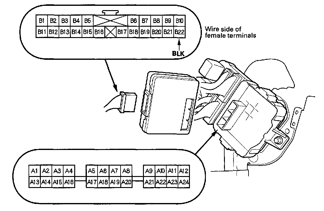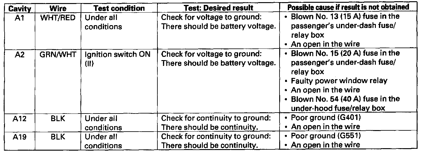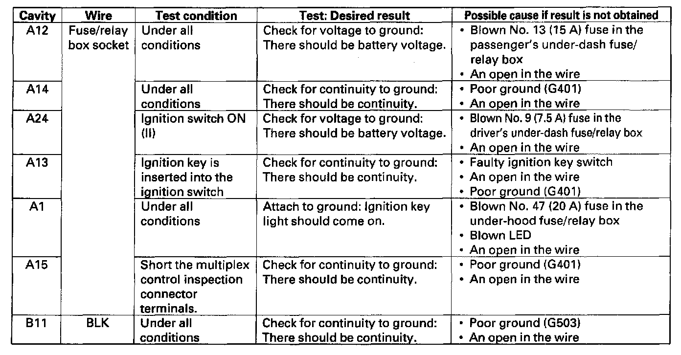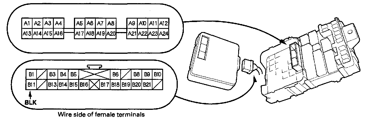 7. Make the following input tests at connector B and the passenger's under-dash fuse/relay box socket.