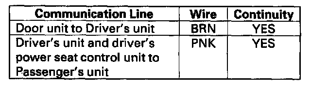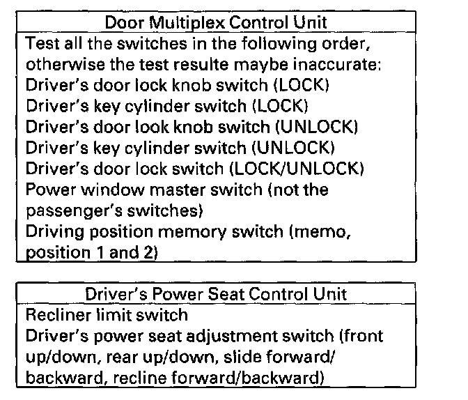 15. Look in the following tables for the switch most closely related to the problem. Test all the switches in the following order, otherwise the test results may be inaccurate. While still in Mode 2, operate that switch to test the wire, switch, and its control unit input.