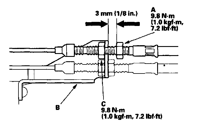 9. Tighten the locknut (C). The cable deflection should be 4 - 6 mm (3/16 - 1/4 in.). If deflection is not within spec, readjust the nuts.