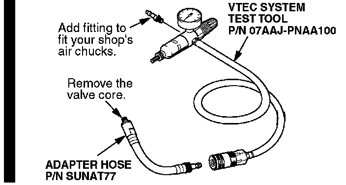 If your shop doesn't have a VTEC System Test Tool, order it from your parts center. The tool consists of a gauge with regulator, a hose, and a coupler.