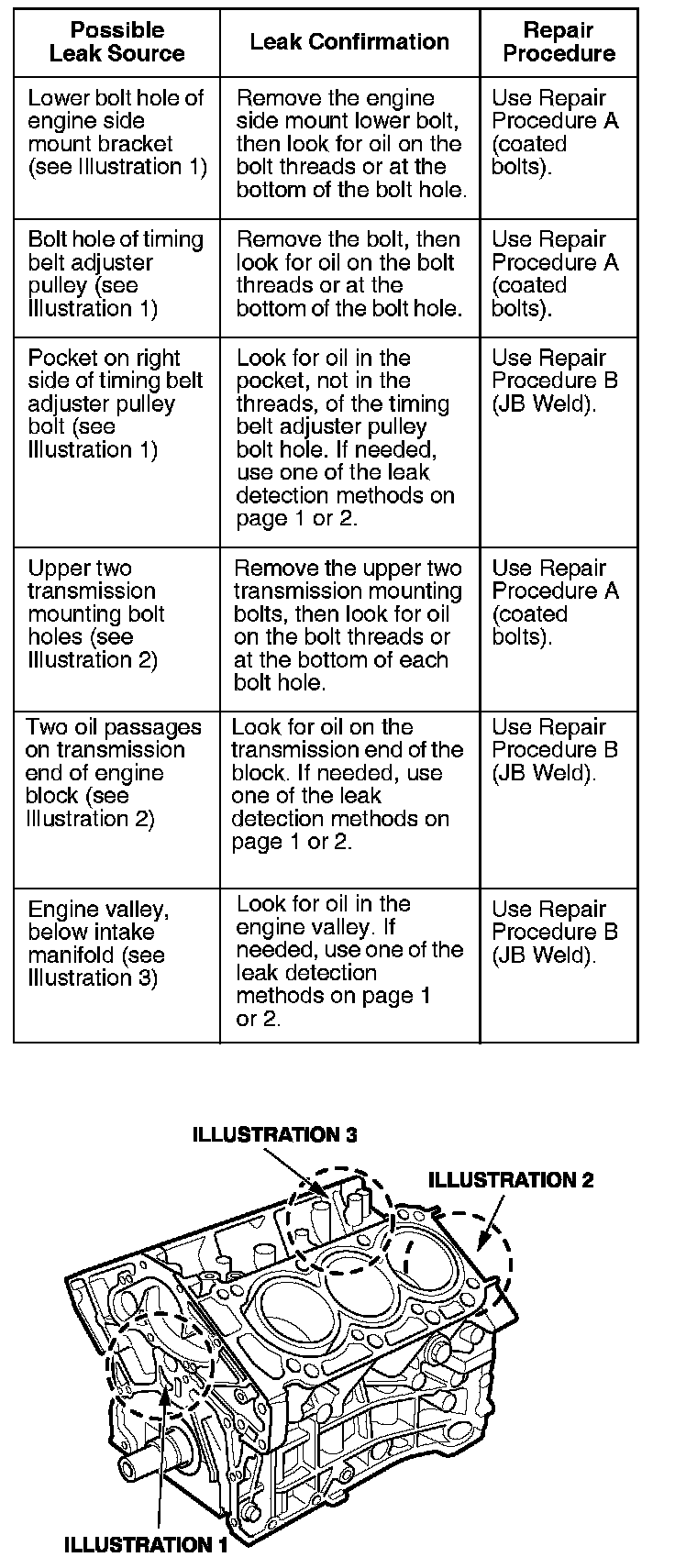 The engine may leak at any of six known areas. Confirm the leak with this chart, then repair it using Repair Procedure A or B.