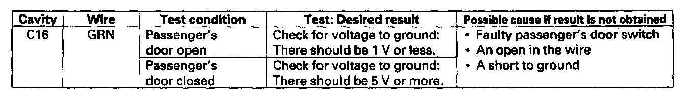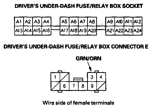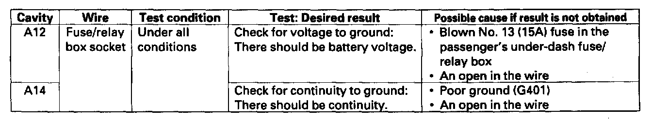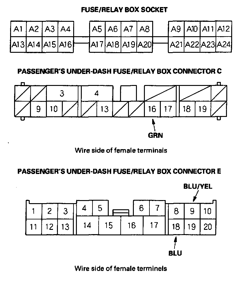 8. With the passenger's multiplex control unit still disconnected, make these input tests at the passenger's under-dash fuse/relay box socket.