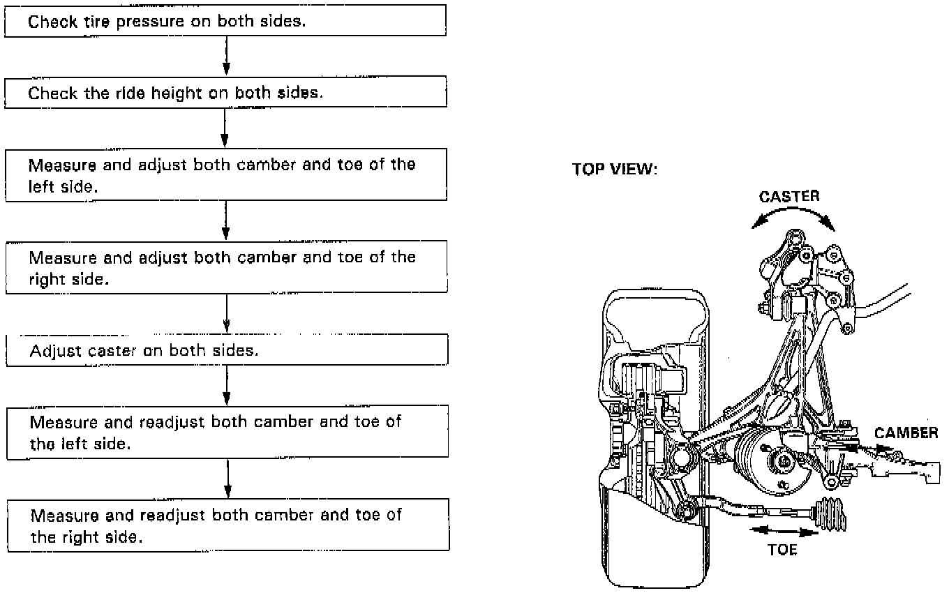 NOTE: NSX/NSX-T four wheel alignment requires the use of equipment designed specifically for four wheel independent suspensions and capable of immediate feedback. The NSX/NSX-T suspension can be adjusted for camber, caster (front only), and toe. However, because each of them relates to the other, the camber changes when the toe is adjusted for example. Therefore, the total adjustment of the front/rear wheel alignment is required whenever one of the elements (camber, caster, or toe) is adjusted.