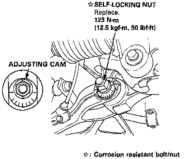 6. Measure the caster on the both sides, and adjust the caster to specifications. Caster: Loosen the pivot adjuster mounting nuts (self-locking nuts) under the compliance pivot, and adjust the caster by turning the adjusting cam.