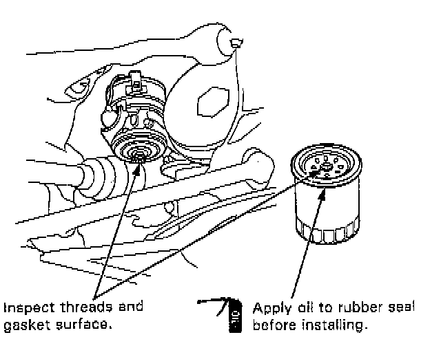 2. Inspect the threads and rubber seal on the new filter. Wipe off the seat on oil filter base, then apply a light coat of oil to the rubber seal and install the filter.