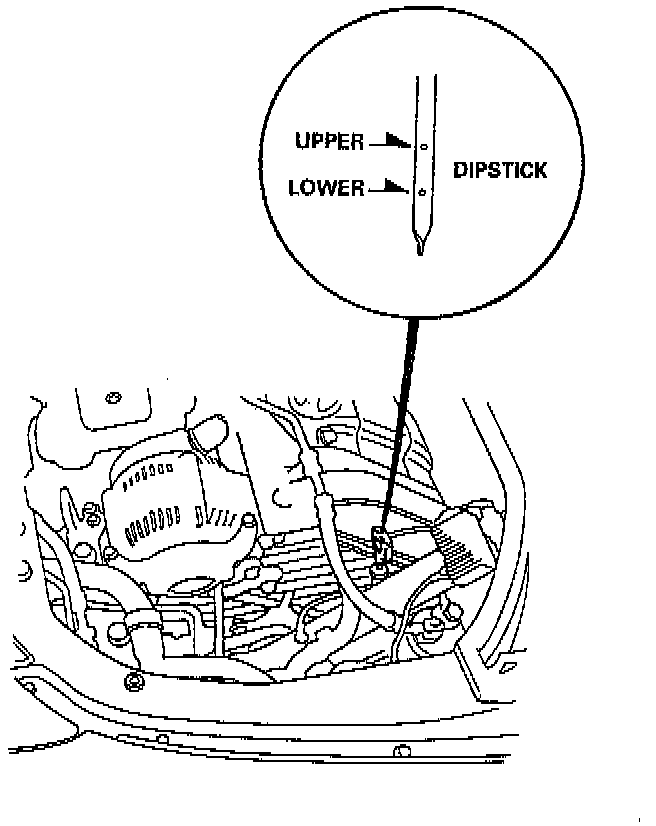 2. Make certain that the oil level indicated on the dipstick is between the upper and lower marks.