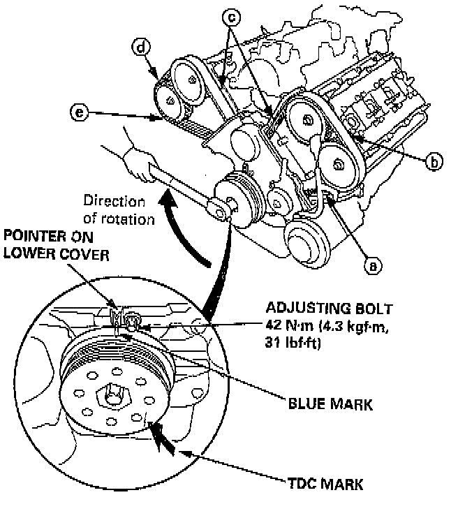 - Always rotate the crankshaft clockwise. Rotating it counterclockwise may result in improper adjustment of the belt tension or cause the belt to jump a tooth on the camshaft pulleys.