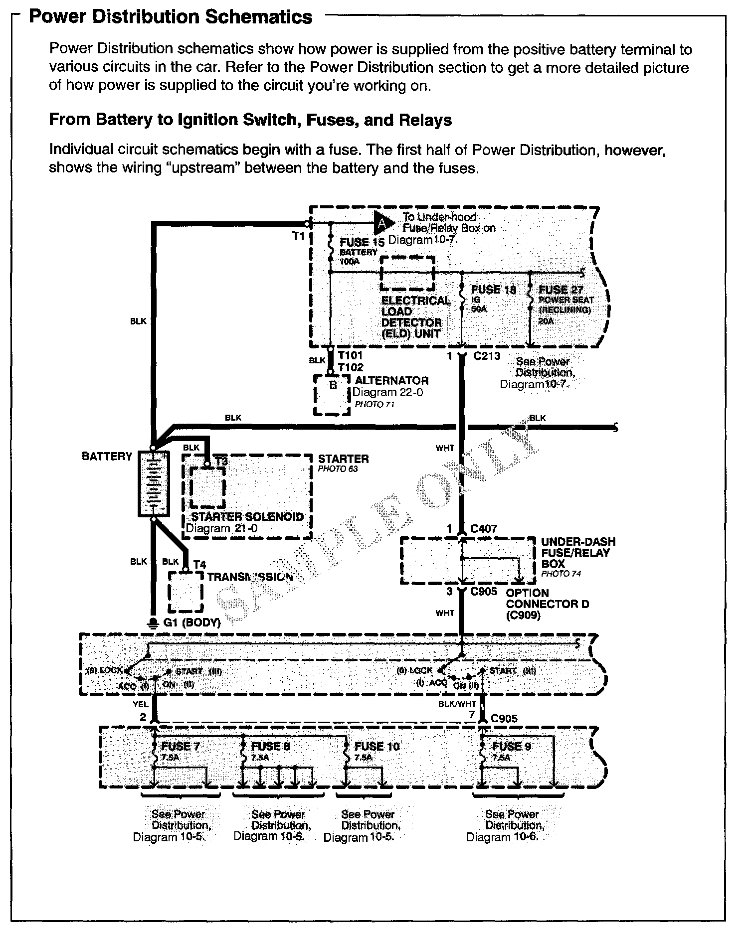 Power Distribution schematics show how power is supplied from the positive battery terminal to various circuits in the car. Refer to the Power Distribution section to get a more detailed picture of how power is supplied to the circuit you're working on.Power Distribution Schematics Part 1: