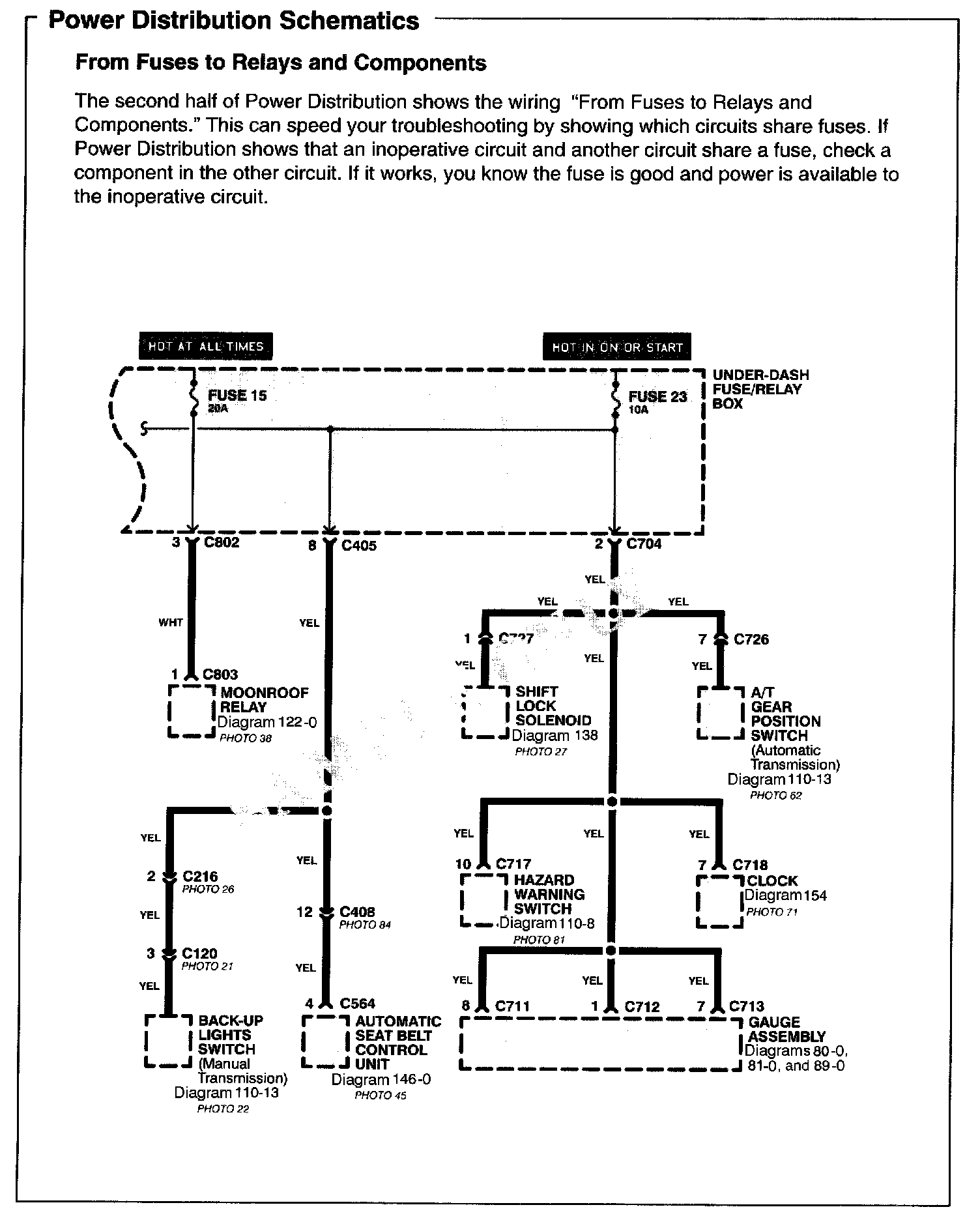 The second half of Power Distribution shows the wiring "From Fuses to Relays and Components." This can speed your troubleshooting by showing which circuits share fuses. If Power Distribution shows that an inoperative circuit and another circuit share a fuse, check a component in the other circuit. If it works, you know the fuse is good and power is available to the inoperative circuit.
