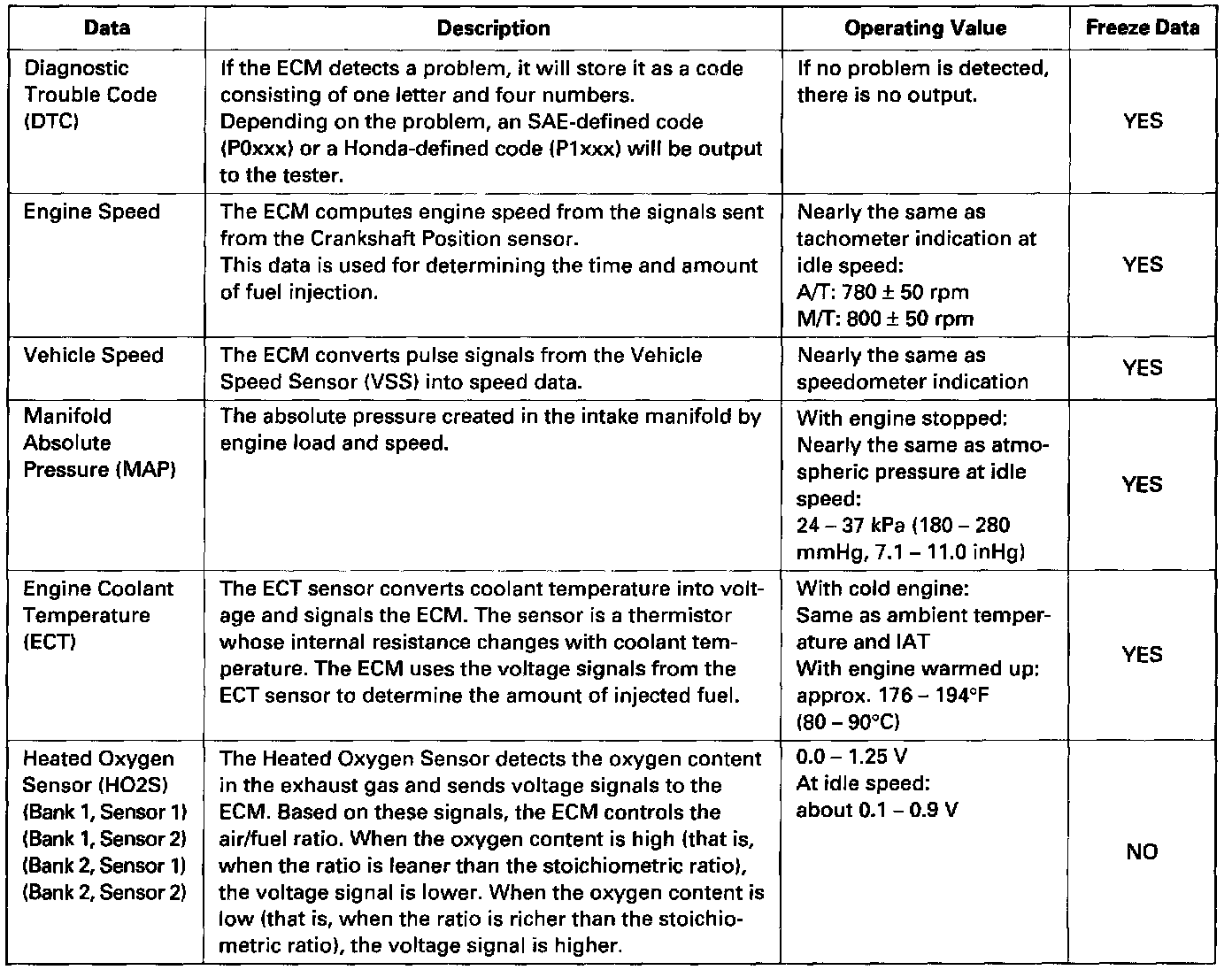 By connecting the OBD II scan tool or the Honda PGM Tester to the 16P data link connector (DLC), various data can be retrieved from the ECM. The items listed in the table below conform to the SAE recommended practice.
