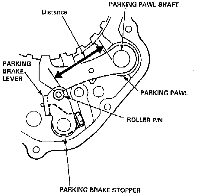 2. Measure the distance between the face of the parking pawl shaft and face of the parking shift arm roller pin as shown.