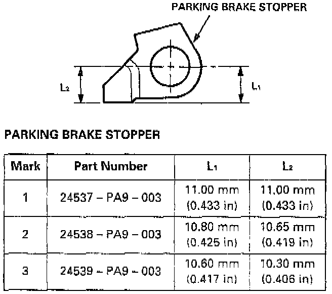 3. If the measurement is out of tolerance, select and install the appropriate parking brake stopper from the table below.