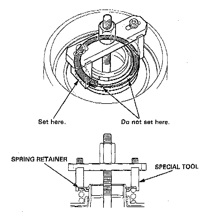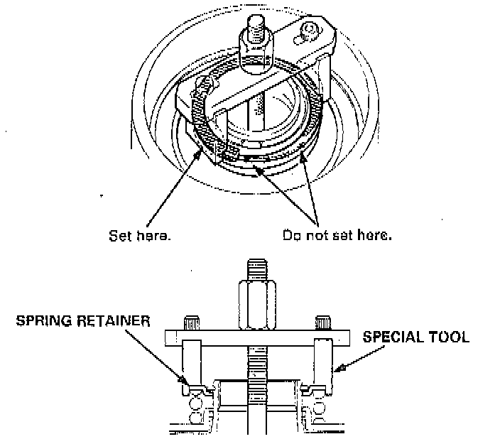 CAUTION: If either end of the special tool is set over an area of the spring retainer which is unsupported by the return spring, the retainer may be damaged. Be sure the special tool is adjusted to have full contact with the spring retainer.