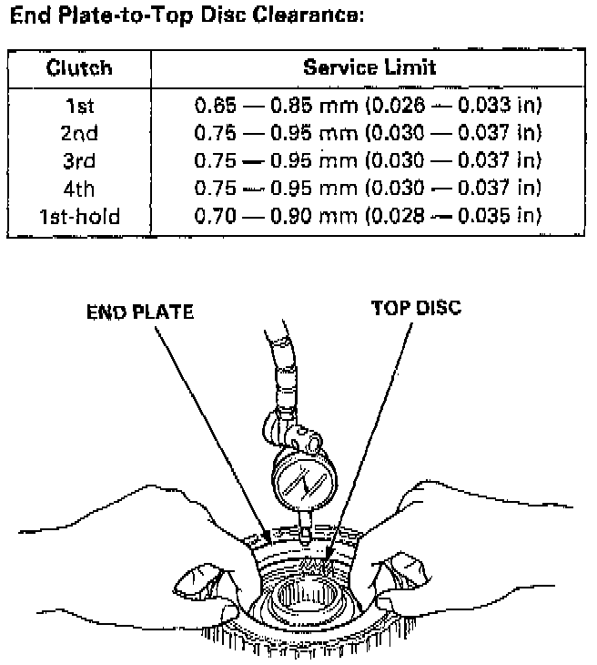14. Measure the clearance between the clutch end plate and top disc with a dial indicator. Zero the dial indicator with the clutch end plate lowered, and lift it up to the snap ring. The distance that the clutch end plate moves is the clearance between the clutch end plate and top disc.