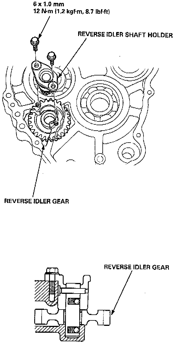 3. Install the reverse idler shaft holder into the transmission housing, then tighten the bolts.