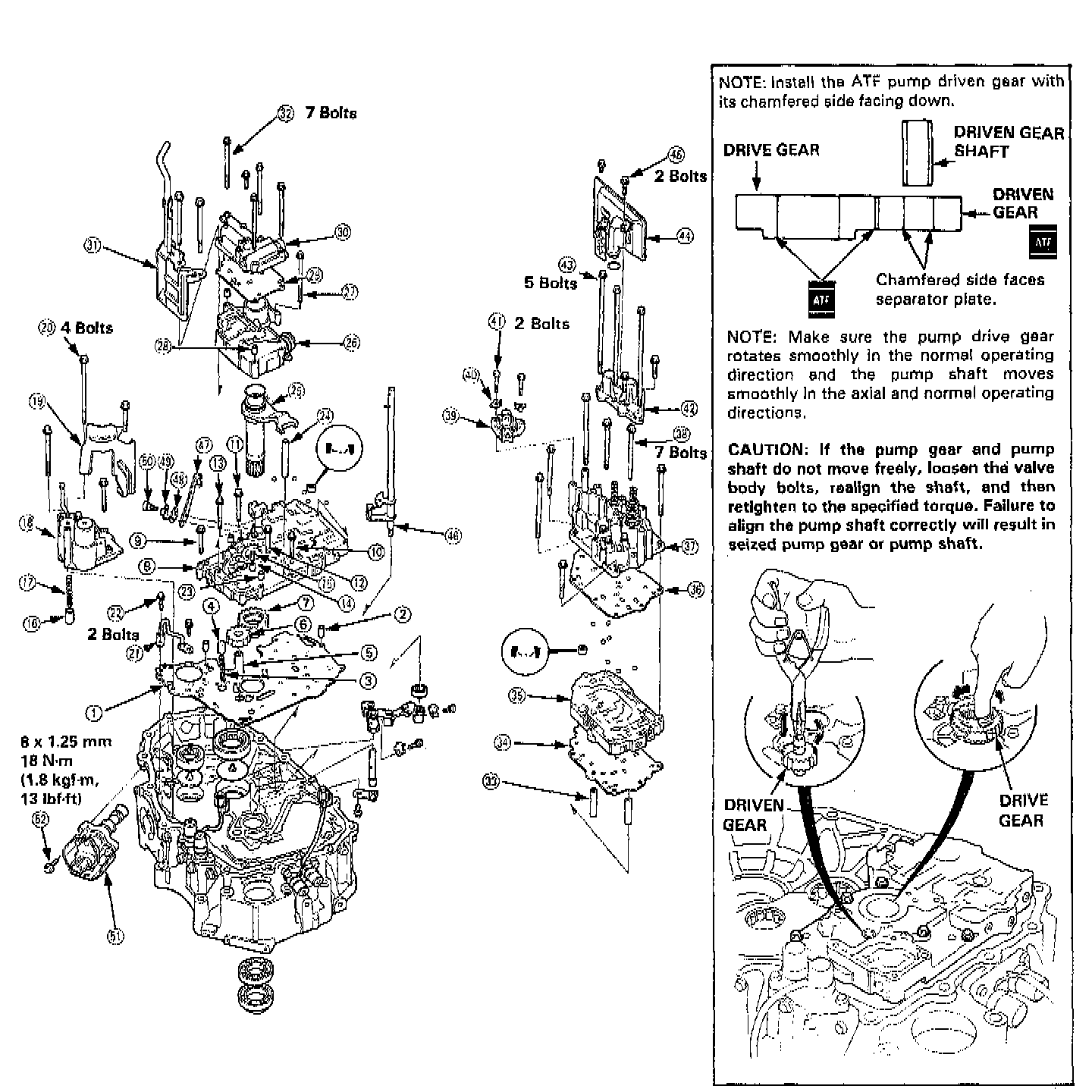 1. Install the main valve body, including the ATF pump gears, onto the torque converter housing, and tighten the main valve body bolts to 12 Nm (1.2 kg/m; 8.7 ft.lbs.).